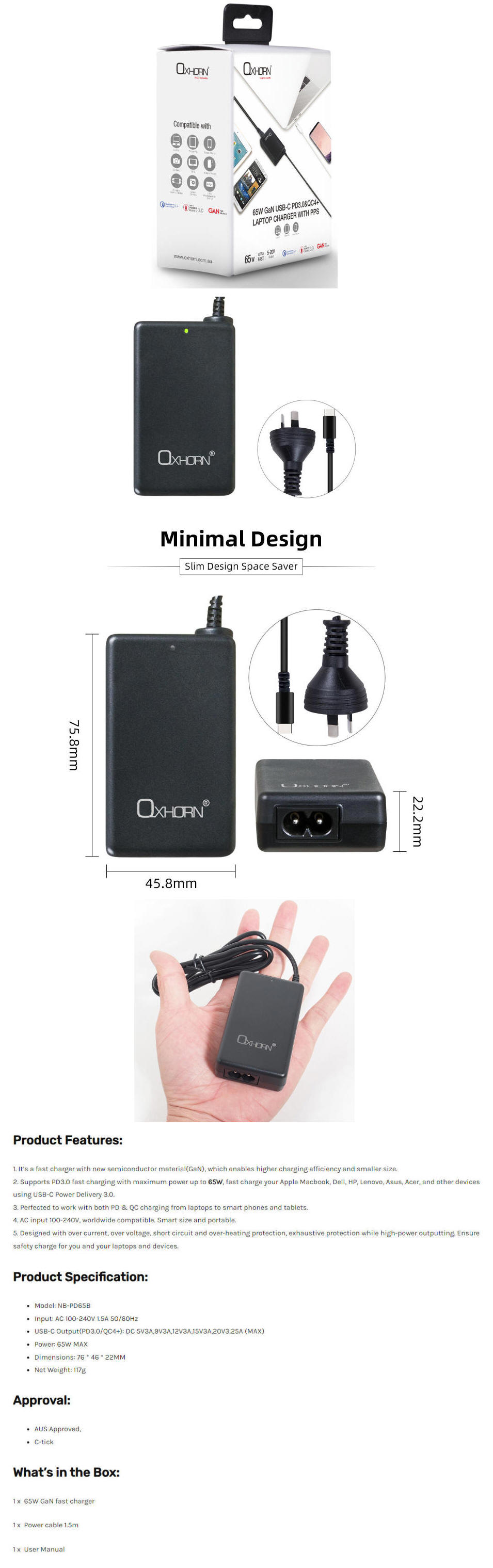 Oxhorn 65W AC Power Adapter USB-C Charger Power Delivery