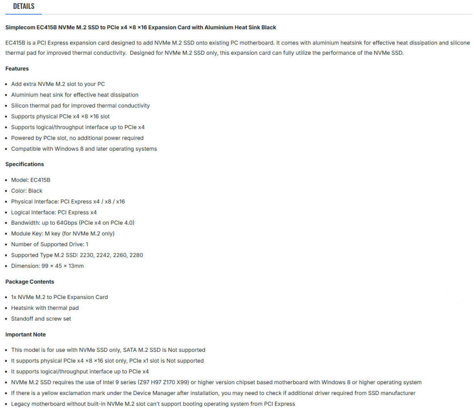 Simplecom EC415B NVMe M.2 SSD to PCIe