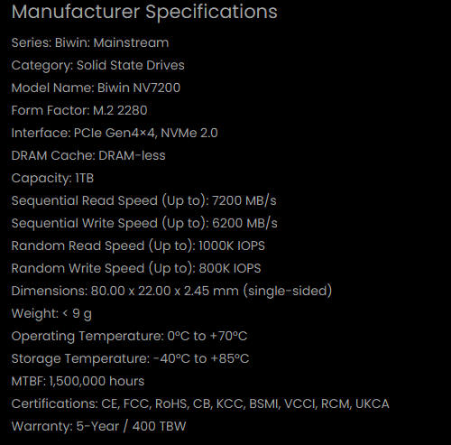 Biwin NV7200 1TB PCIe Gen 4 NVMe M.2 2280 SSD