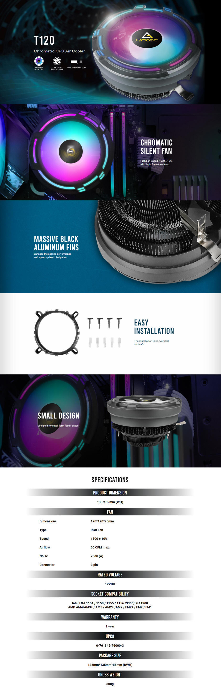 Antec T120 Compact CPU Air Cooler, 60CFM, Ultra cooling low noise. RGB, Intel: 115x, 1200,AMD: AM2(+), AM3, AM3+, AM4+, FM1 $30.00