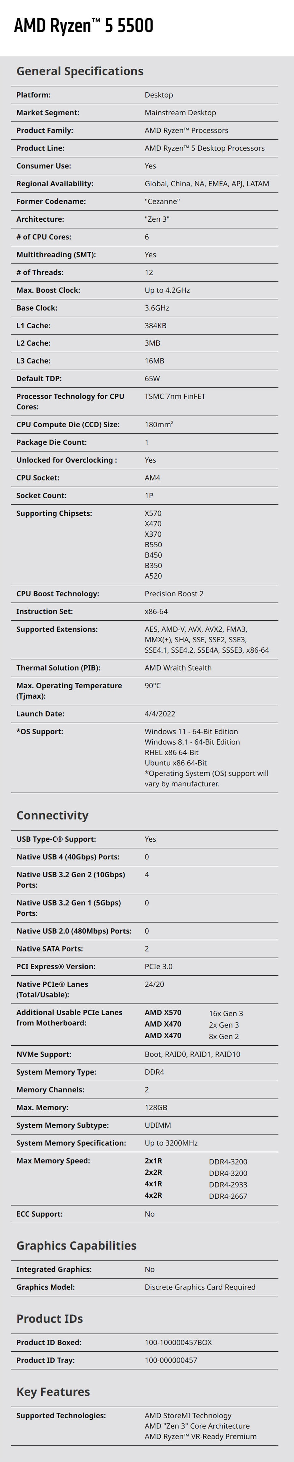 AMD Ryzen 5 5500 6C/12T 4.20GHz AM4 65W Processor with Wraith Stealth Cooler