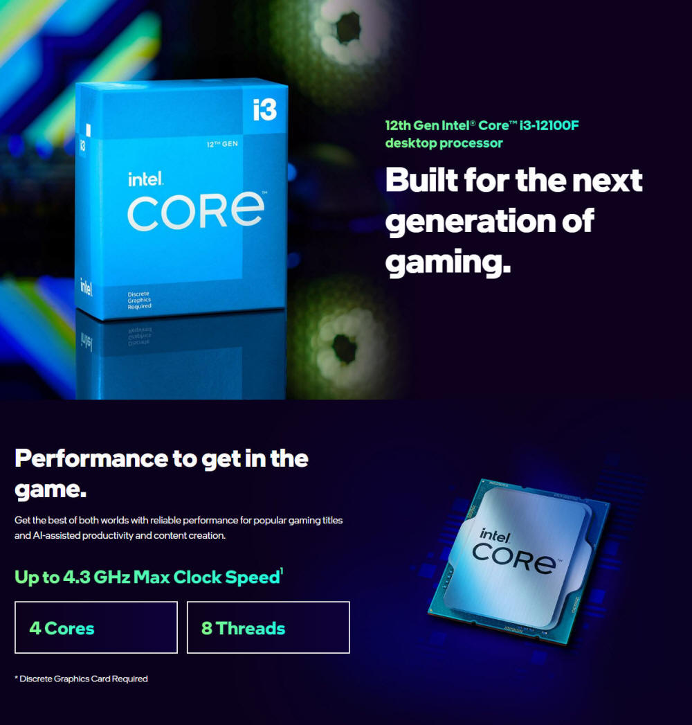 Intel 12th Gen Core i3-12100F 4 Cores 8 Threads 4.3 GHz Processor with CPU Cooler