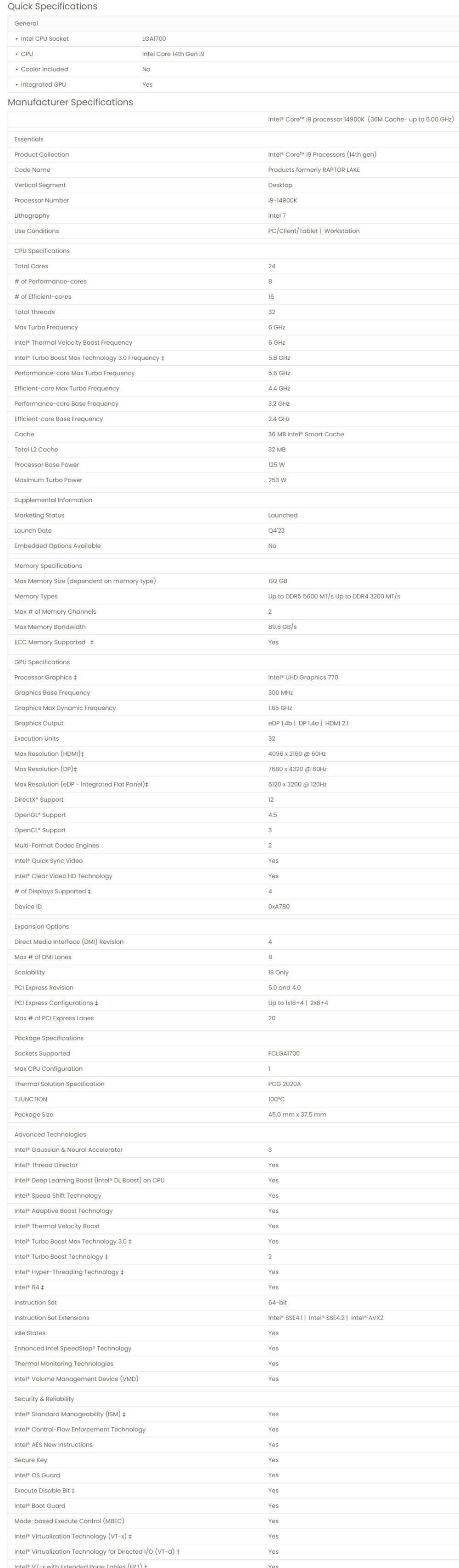 Intel 14th Gen Core i9-14900K 24 Cores 32 Threads 6.0GHz Processor No Cooler Included