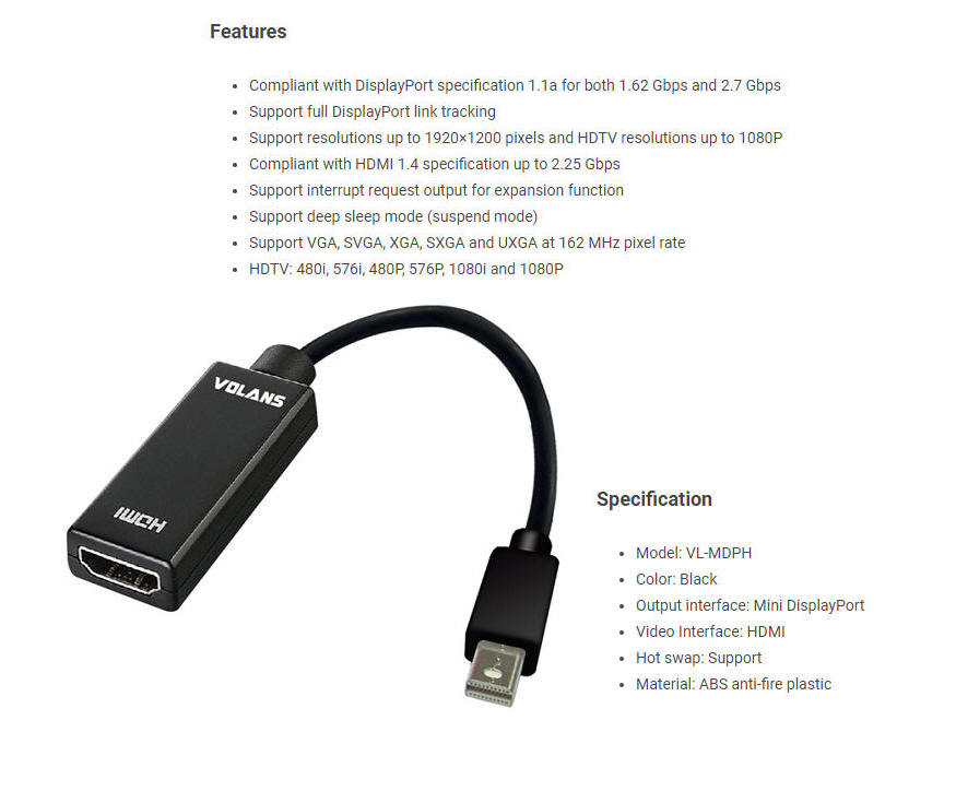 Volans VL-MDPH, Mini DisplayPort to HDMI Male to Female Converter