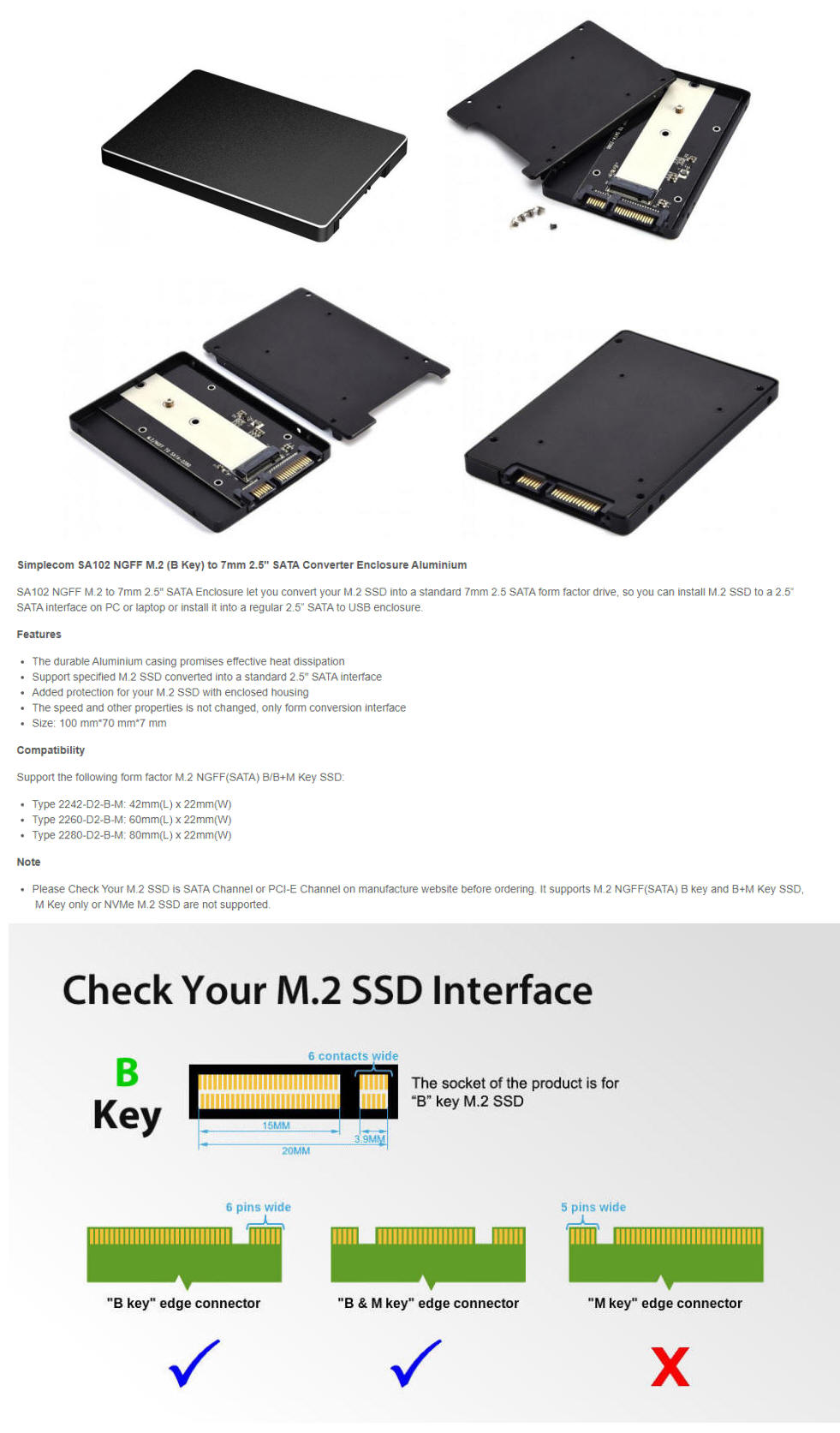 Simplecom SA102, NGFF M.2 (B Key) to 7mm 2.5" SATA Converter Enclosure Aluminium