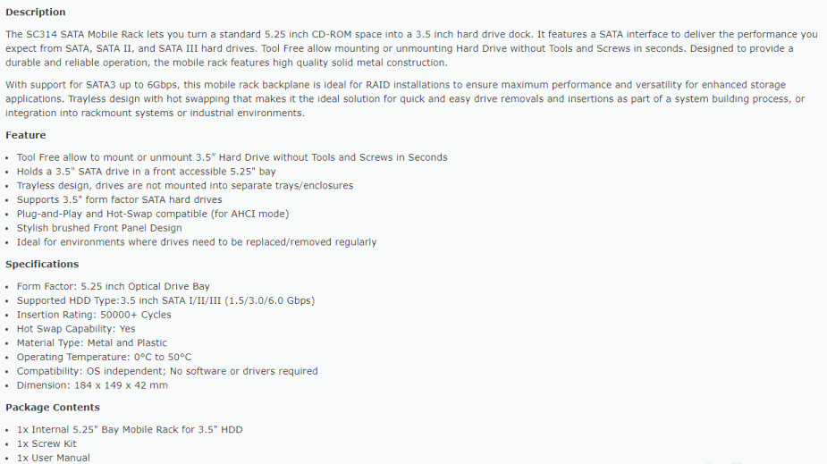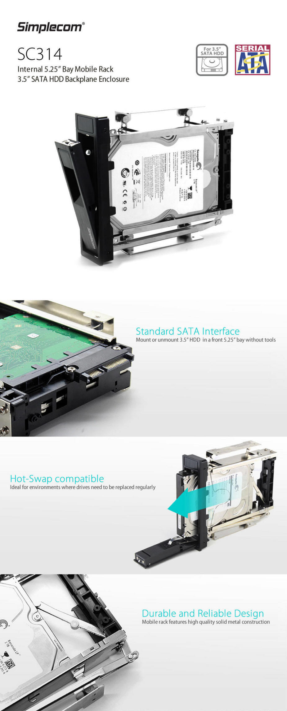 Simplecom SC314, Internal 5.25" Bay Mobile Rack 3.5" SATA HDD Backplane Enclosure