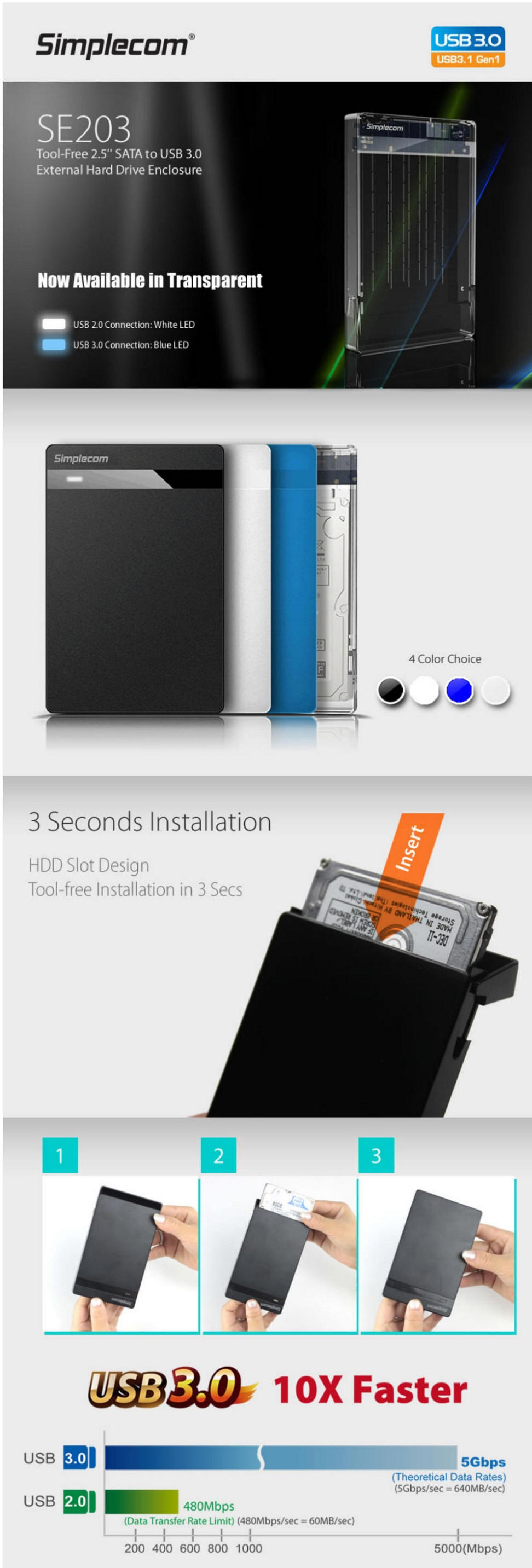 Simplecom SE203,Tool Free 2.5"Hard Drive Enclosure,