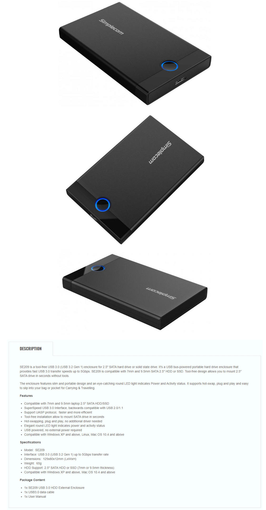 Simplecom SE209 Tool-free 2.5" SATA HDD SSD to USB 3.0 Enclosure