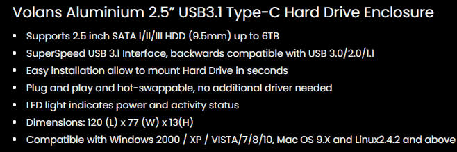 Volans Aluminium 2.5” USB3.1 Type-C Hard Drive Enclosure