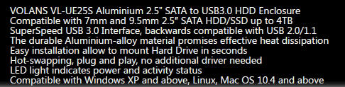 Volans VL-UE25S, Aluminium 2.5” SATA to USB3.0 HDD Enclosure