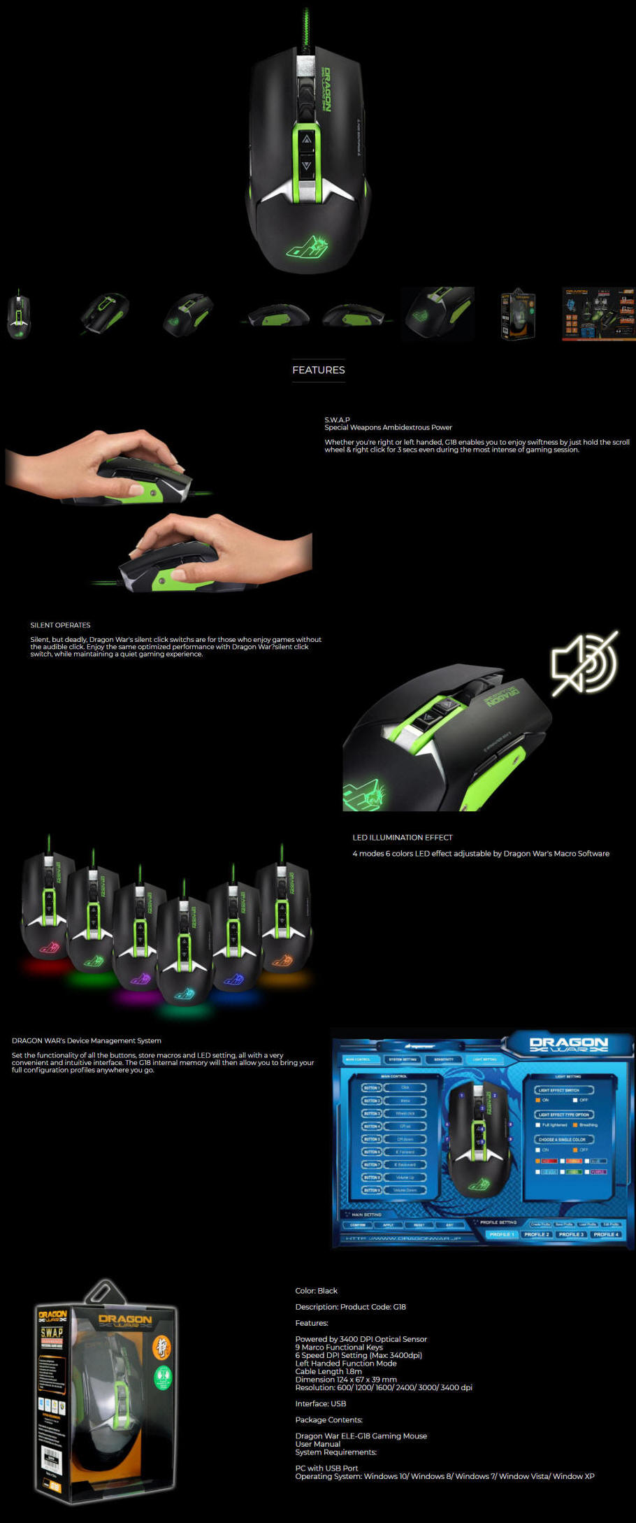 Dragonwar ELE-G18, S.W.A.P. RGB Ambidexterous 3200dpi Gaming Mouse, Black