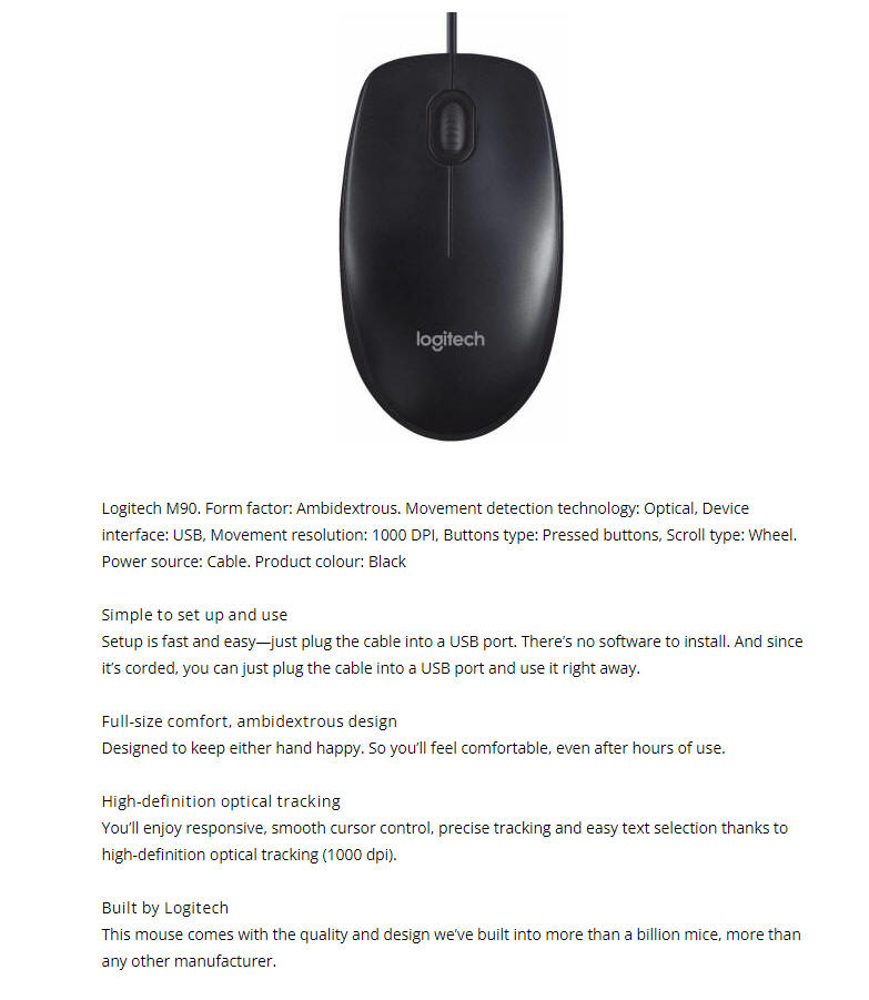 Logitech M90 Corded Optical Mouse Black Full-size USB Mouse