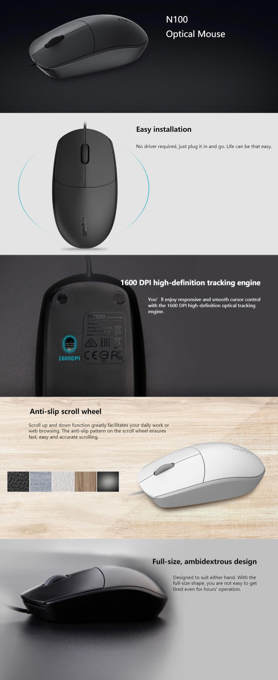 RAPOO N100 Wired USB Optical 1600DPI Mouse