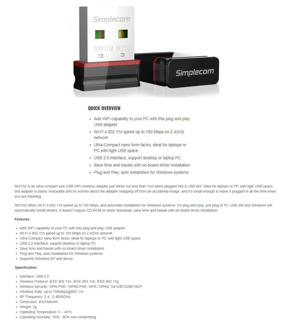 Simplecom NW102 N150 2.4GHz 802.11n Nana