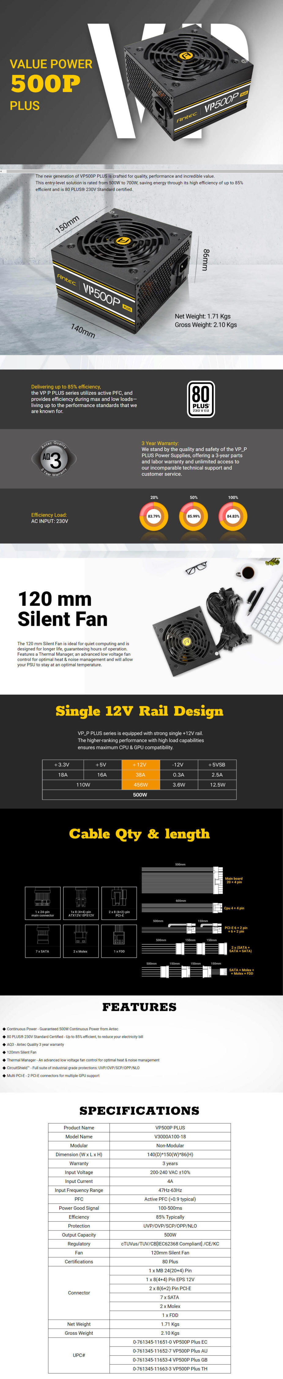 Antec VP500P-PLUS, 500w PSU, 80 Plus AC 120V - 240V, Continuous Power, 120mm Silent Fan