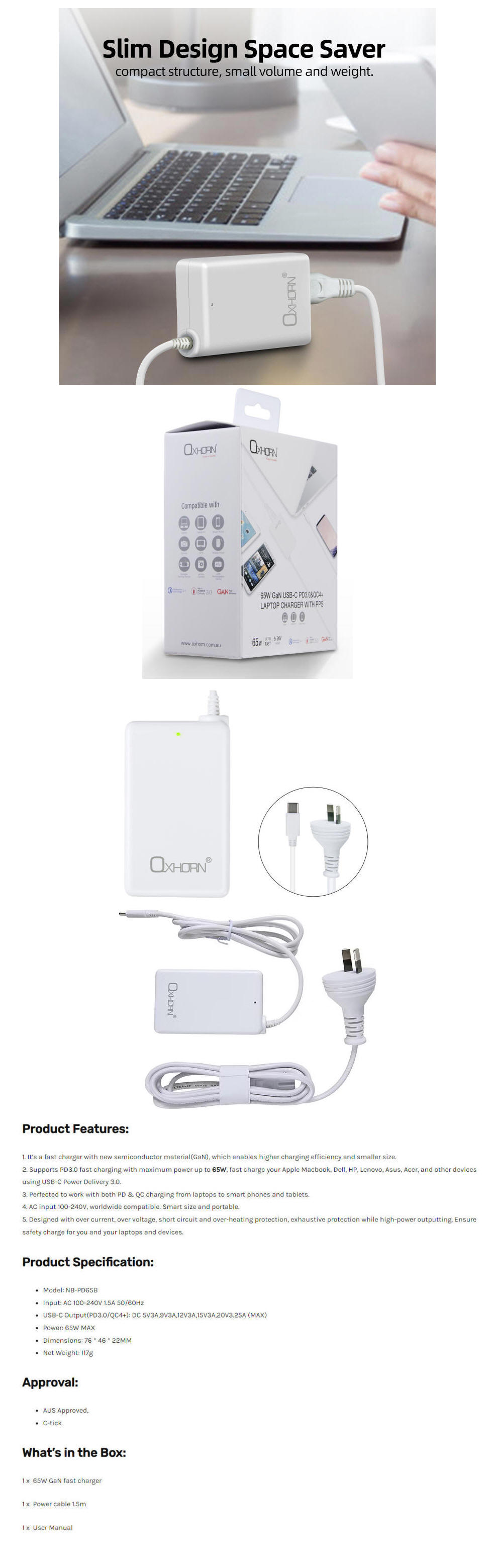 Oxhorn 65W AC Power Adapter USB-C Charger Power Delivery