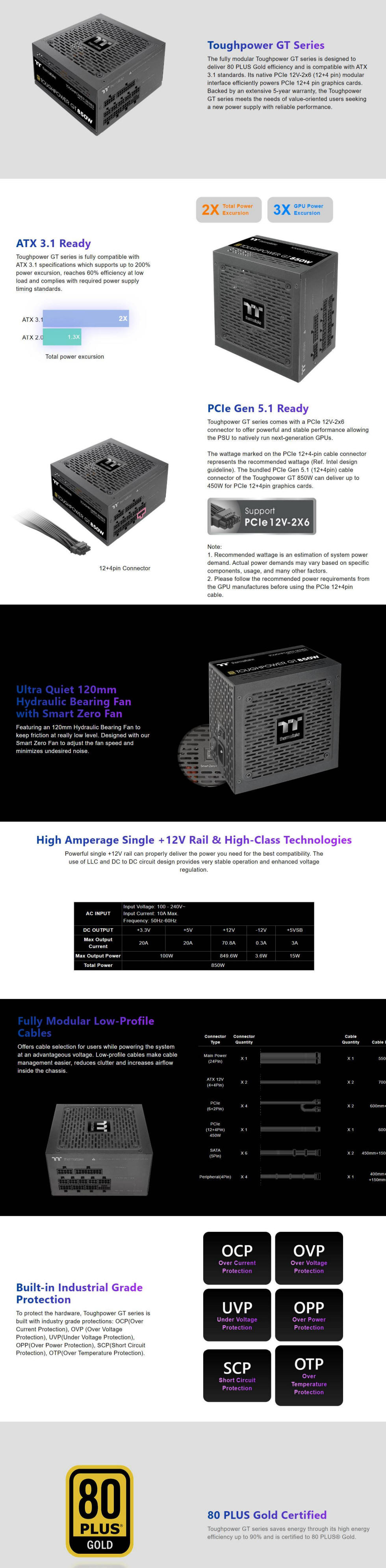 Thermaltake Toughpower GT 850W 80+ Gold ATX 3.1 Fully Modular Power Supply - Blacky