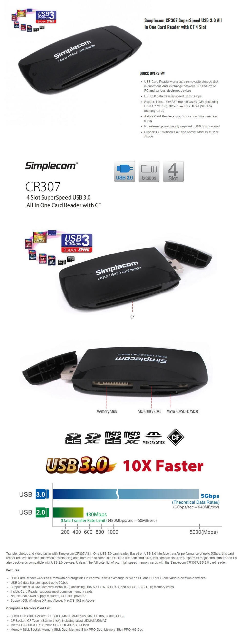 Simplecom CR307 SuperSpeed USB 3.0 Card Reader 4 Slot with CF