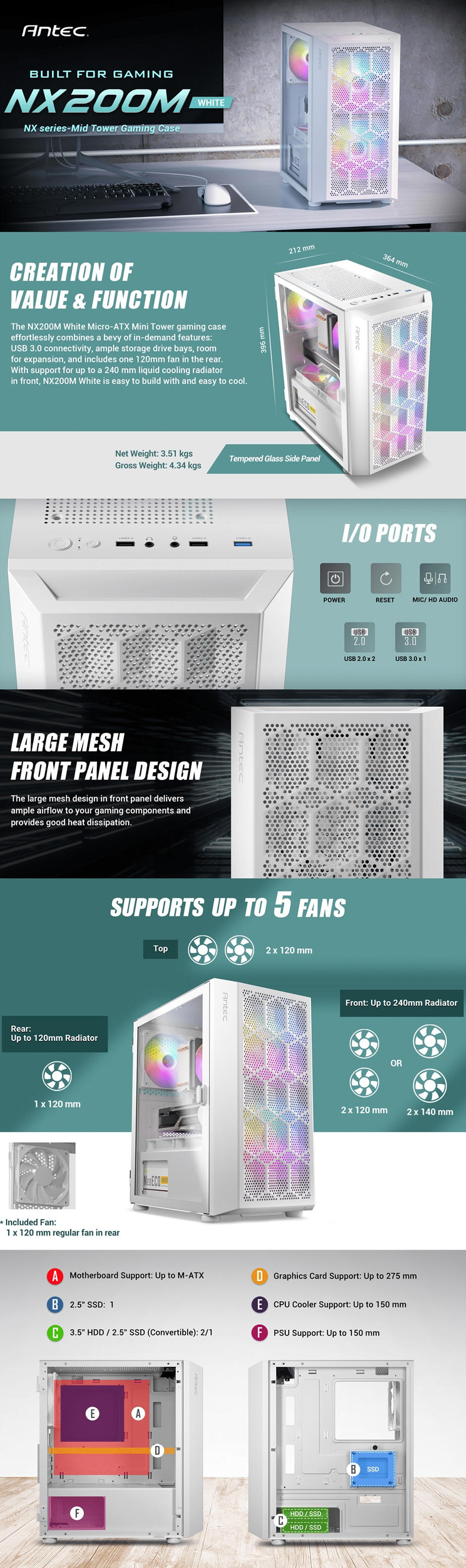 Antec NX200M-RGB, Mini-Tower, Tempered Glass, M-ATX/ITX,